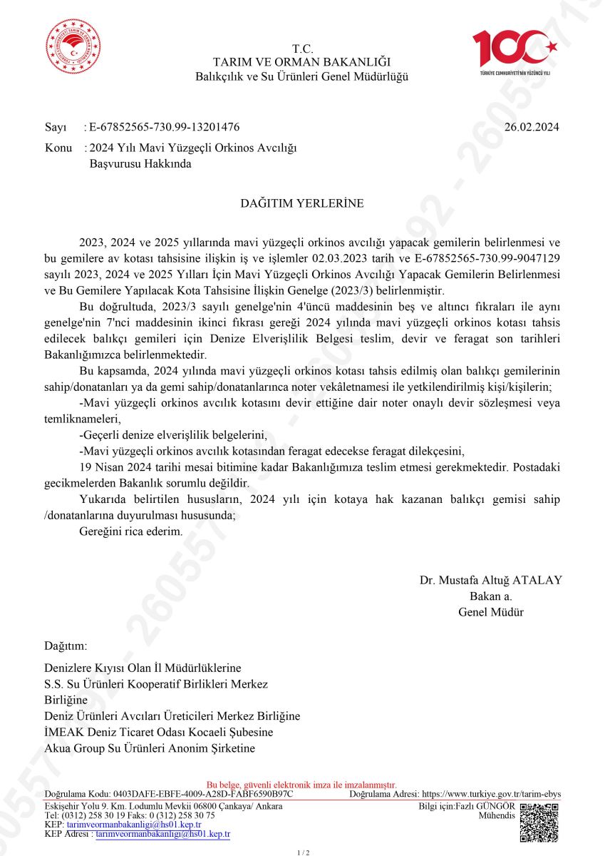 2024 Yılı Mavi Yüzgeçli Orkinos Avcılığı Başvurusu Hakkında